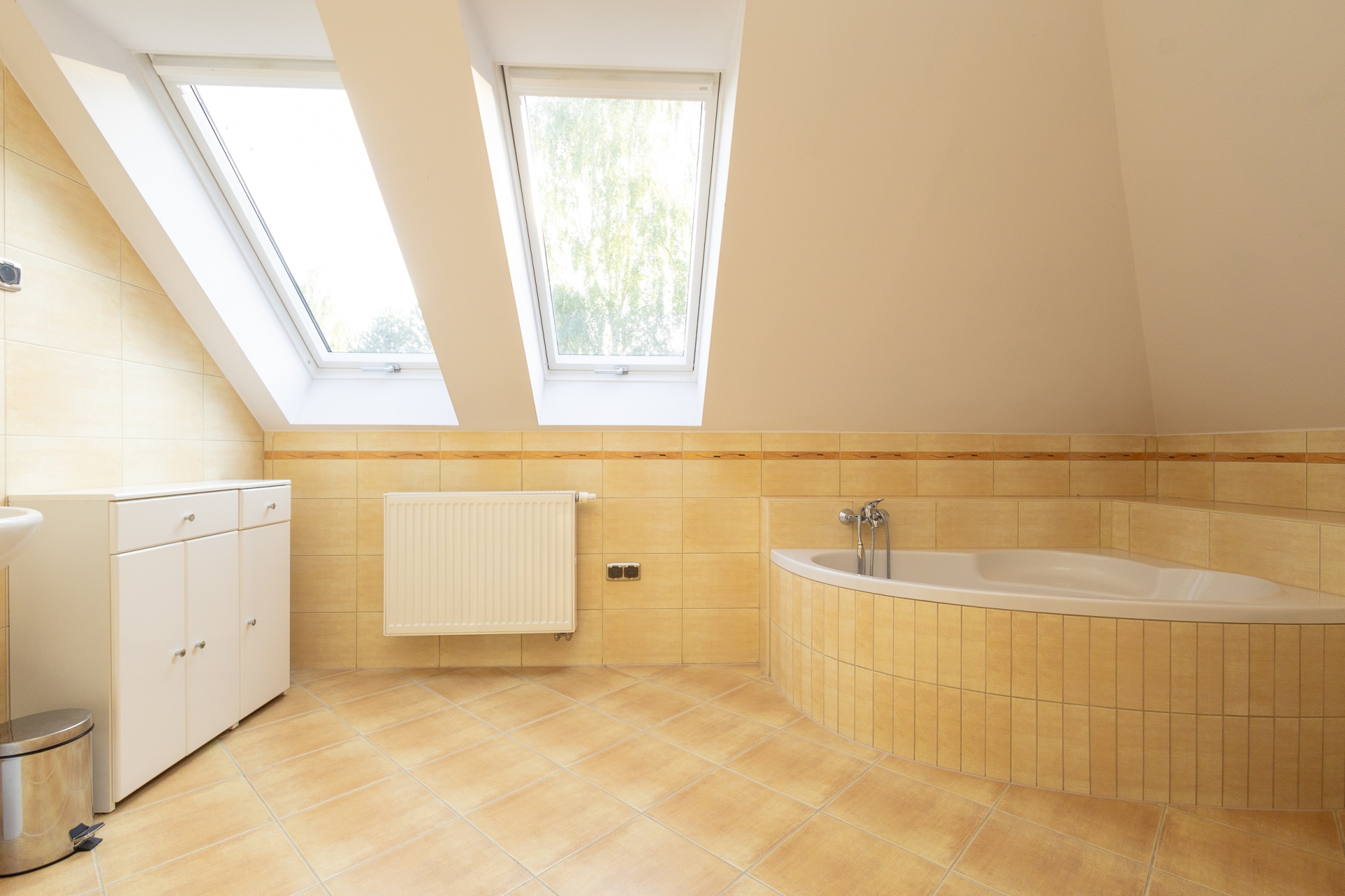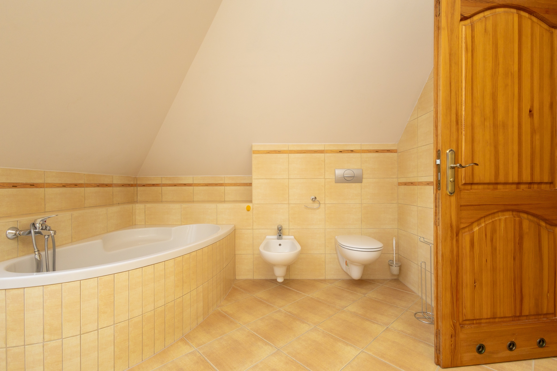 Łazienka na piętrzeBukowinkaŁazienkiŁazienka na piętrzeŁazienka na piętrze - wanna, kabina prysznicowa, zlew, szafka na kosmetyki, toaleta, bidet